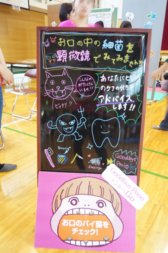 小学生向けに額模型に人口プラークで汚れを付けて、で歯ブラシ・フロスで落としてみる。